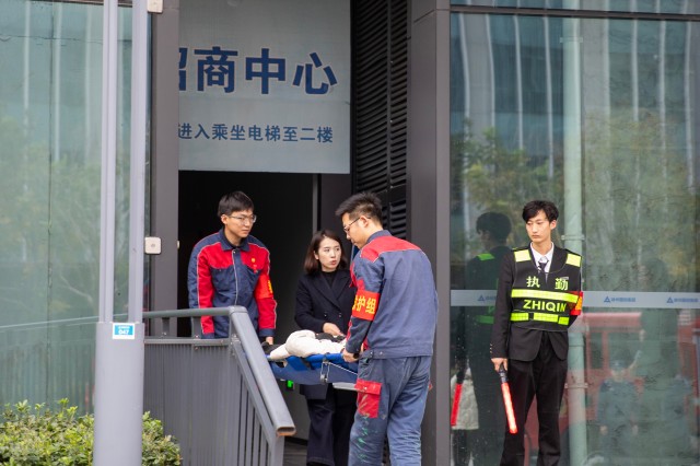 15:30,演練正式啟動。消控室值班人員發(fā)現(xiàn)消防主機(jī)報警后,立即查看著火點(diǎn)信息,迅速通知巡邏崗前往核實。巡邏崗抵達(dá)513室后,發(fā)現(xiàn)現(xiàn)場濃煙冒出且有被困人員,立即向中控室報告。通訊聯(lián)絡(luò)組隨即啟動應(yīng)急程序,將消防主機(jī)切換為自動狀態(tài),并向總指揮匯報火情??傊笓]果斷下達(dá)指令,各專項小組迅速響應(yīng),按照預(yù)案展開行動。隨著滅火行動組成功撲滅全部明火,各小組依次向總指揮匯報任務(wù)完成情況,滅火救援綜合實戰(zhàn)演練部分圓滿結(jié)束。
